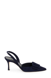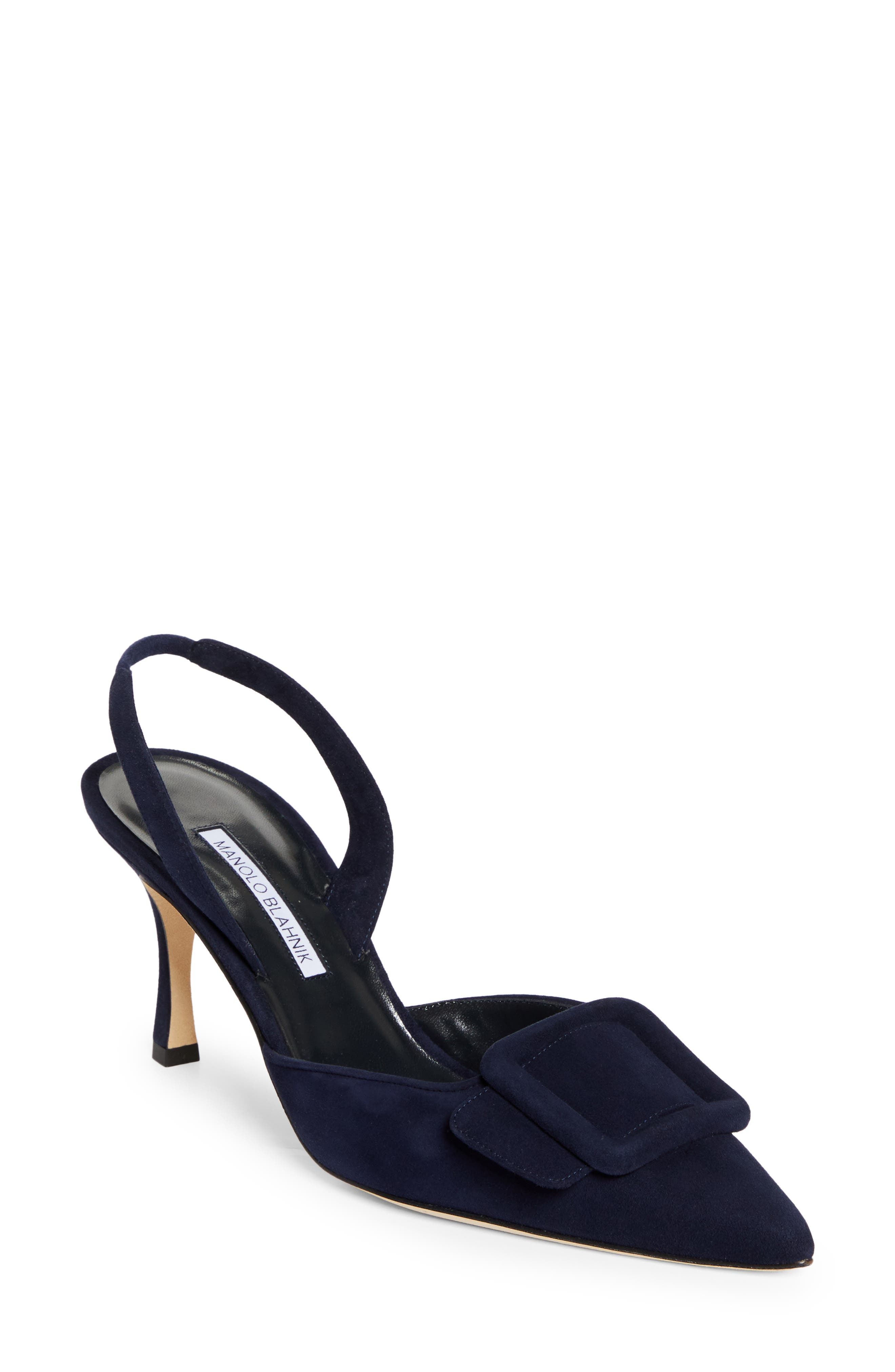 A silhouette first developed by Manolo in 1991 for Isaac Mizrahi's catwalk collection, this rich suede pump boasts a retro slingback and oversized covered buckle. 3" (76mm) heel (size 8.5) Elasticized slingback strap Leather upper, lining and sole Made in Italy Designer Shoes