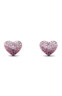 Puffy heart charms create these signature earrings that shine brilliantly with crystal pave. 13mmW x 11.5mmL Post back Brass/silvertone plate/glass Imported