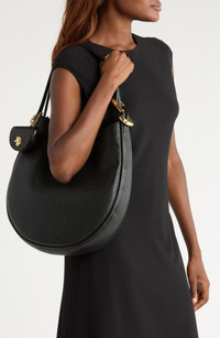 Glinting hardware stands out against the richly pebbled leather on a crescent-shaped shoulder bag designed with a spacious interior and removable turnlock pouch for optimal organization. 3 3/4" x 13 1/2" x 12" Magnetic-snap closure Shoulder strap Interior zip pocket Removable turnlock pouch Lined Leather Imported