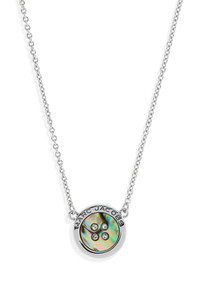 Inspired by Marc Jacobs's love of trims and detailing, this dainty necklace is centered with a playful button pendant set with crystal 'buttonholes.' 16" length; 2" extender; 13mm diameter pendant Lobster clasp closure Goldtone plate/mother-of-pearl/crystal or silvertone plate/abalone/crystal Imported