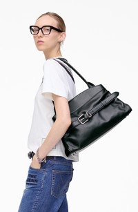 A belted strap with high-polish buckles cinches the slouchy silhouette of this spacious satchel designed with a neatly divided interior for easy organization. 6 1/4" x 15 3/4" x 10 3/4" Magnetic-snap closure Shoulder straps Dual interior compartments with center zip-pocket divider Interior wall pocket Cotton lining Leather Imported