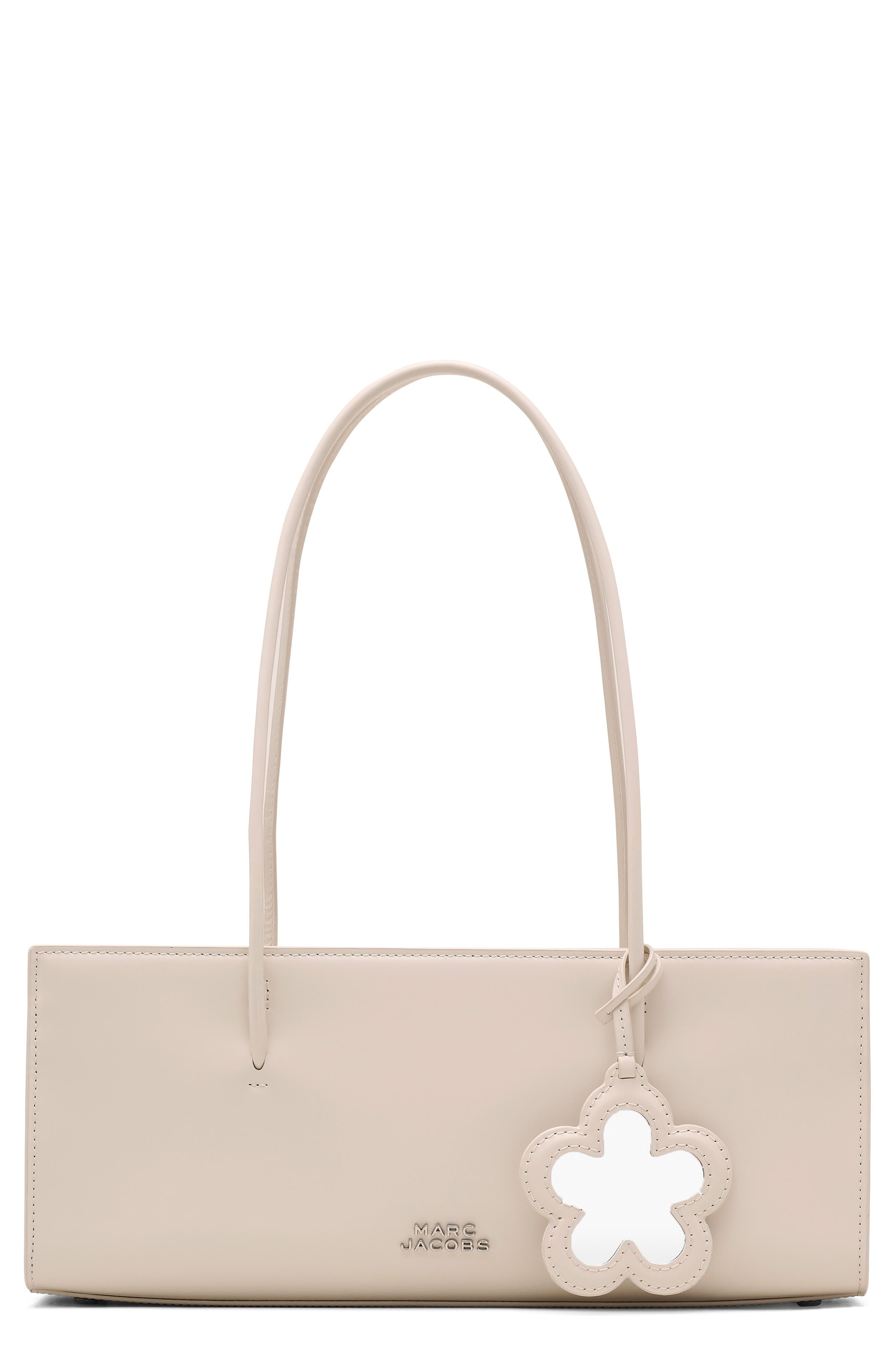 Marc Jacob's beloved daisy motif defines a mirror charm that accents an East-West leather satchel featuring a divided interior and suspended from elongated shoulder straps. Magnetic-snap closure Shoulder straps Exterior slip pocket Dual interior compartments with center zip-pocket divider; card slot Structured silhouette with flat base and protective metal feet Cotton lining Leather Imported