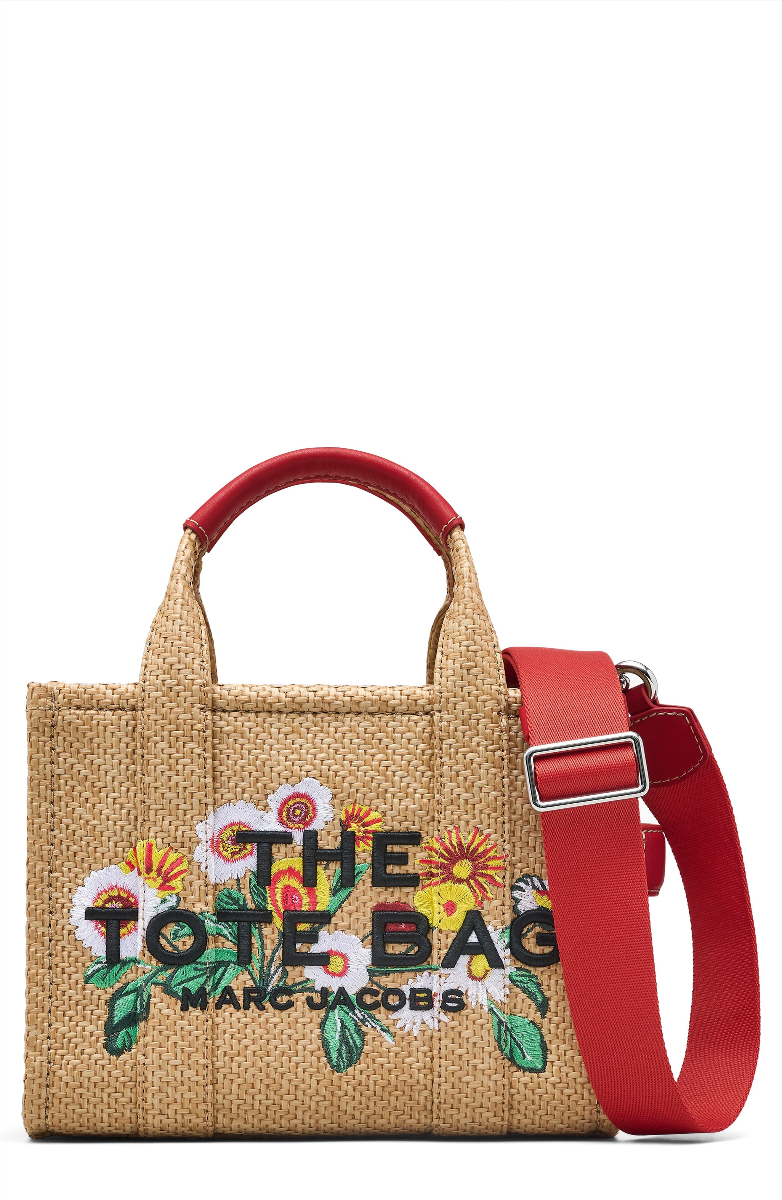 A basket-weave faux-raffia body and vivid floral embroidery blossoming from behind the logo put a resort-ready spin on this brand-signature tote in a scaled-down size. Top zip closure Top carry handles; removable, adjustable crossbody strap Interior slip wall pocket; card slot Cotton-twill lining Synthetic Imported