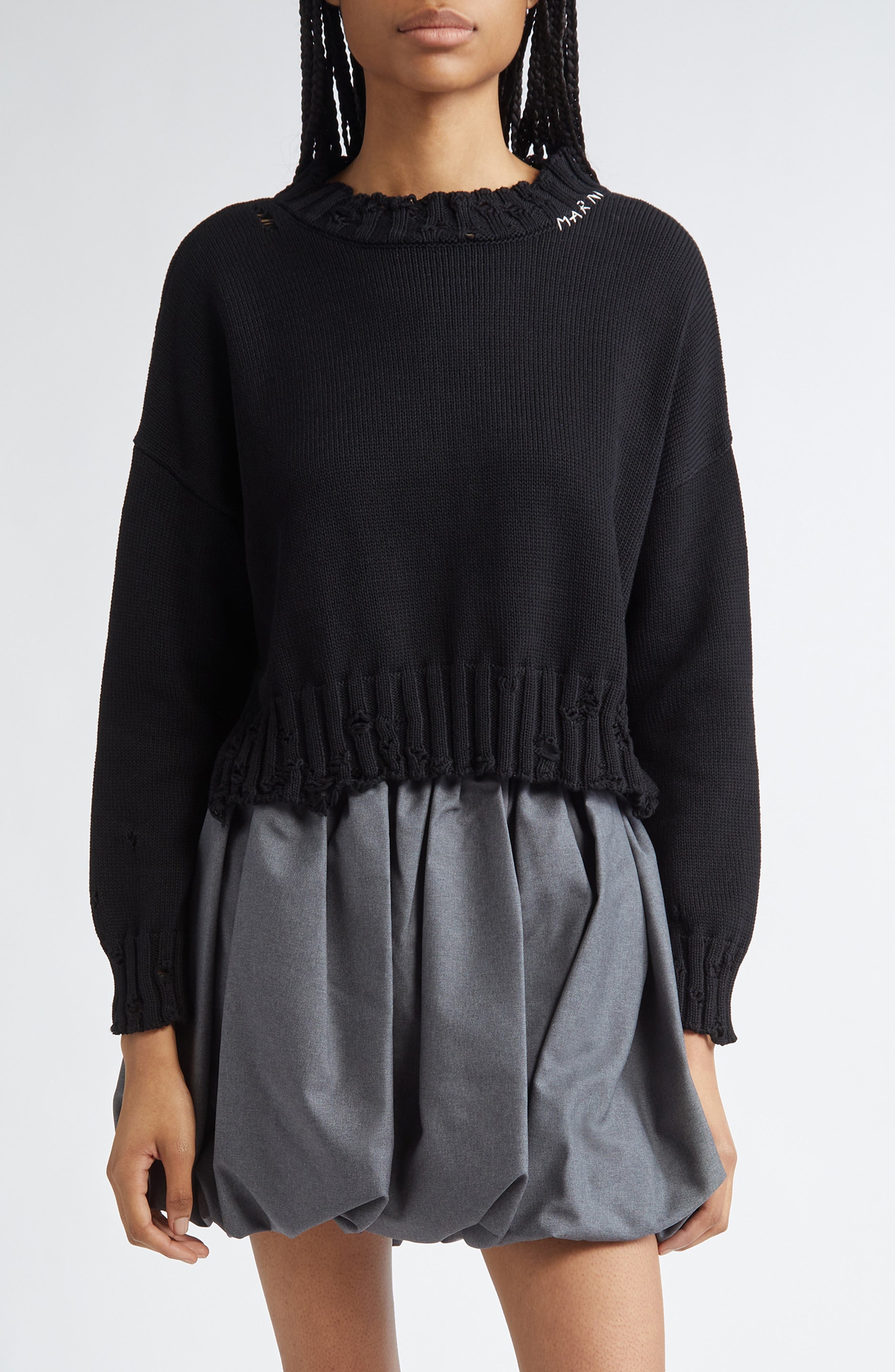 Marni Distressed Embroidered Logo Cotton Sweater in Black at Nordstrom