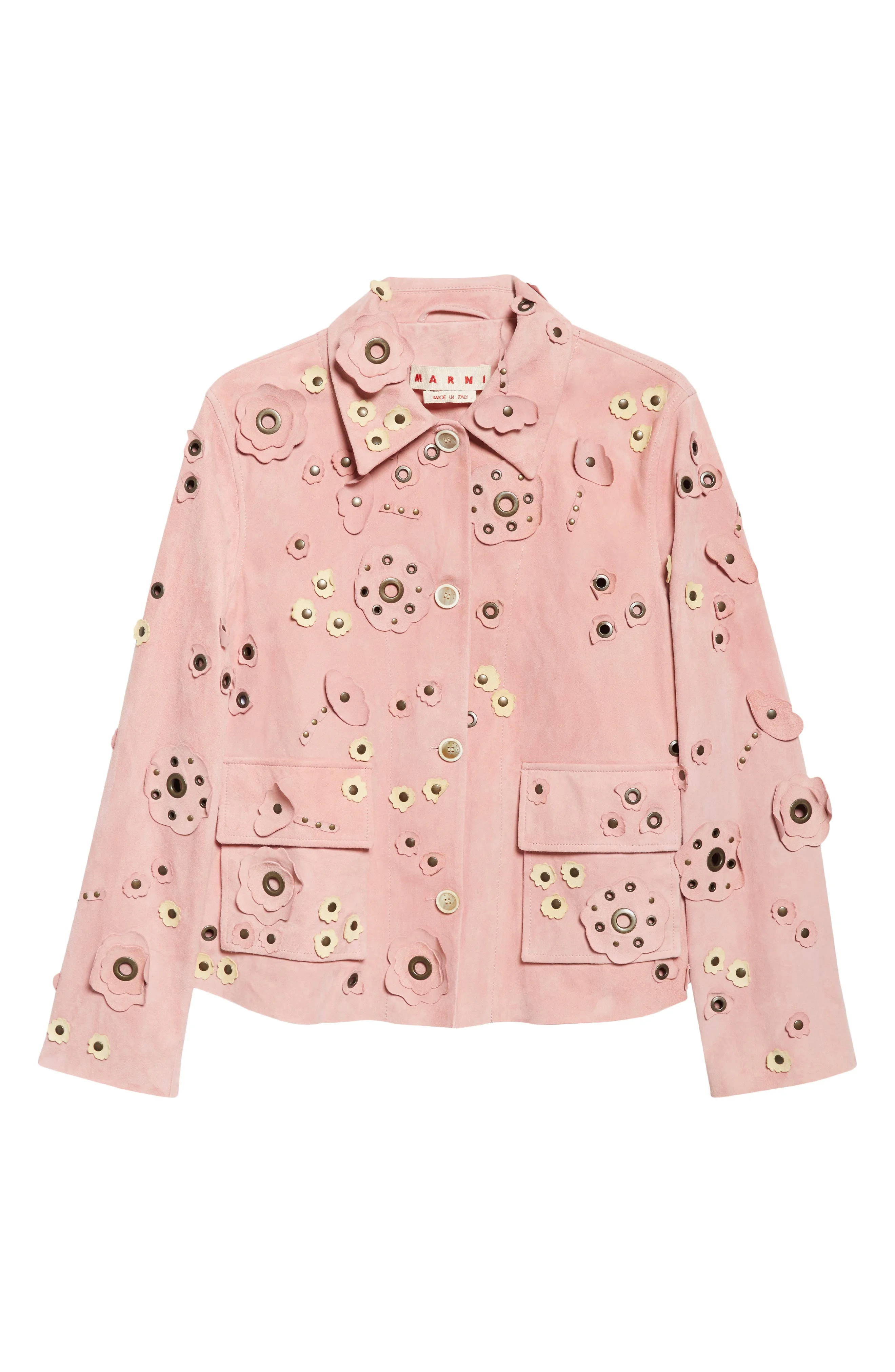 Unearthed from the archives, whimsical daisy appliques spring forth in a garden of grommets and studs on this boxy cargo jacket cut from velvety Italian suede. Front button closure Spread collar Cargo flap-patch pockets Lined Leather Professional leather clean Made in Italy Designer Clothing