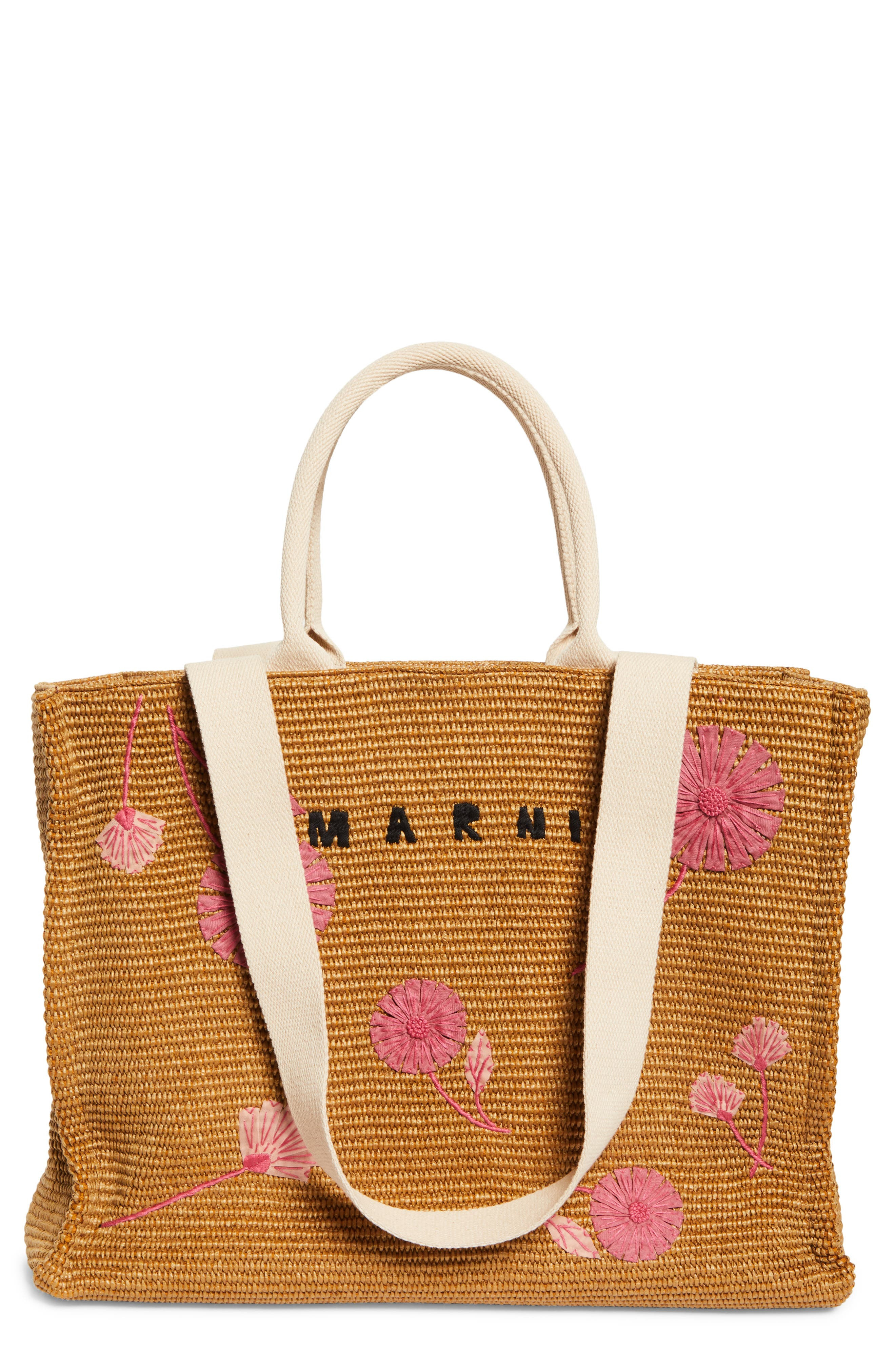 Pretty pink blooms embroidered with zigzag whipstitching bring Marni's playful energy to a branded tote woven in Italy from airy raffia and fitted with carry handles and shoulder straps. Open top Top carry handles; shoulder straps Structured silhouette with flat base for stability Textile Made in Italy Designer Handbags