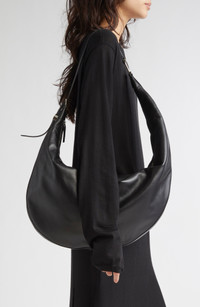 The Milanese label brings its innovative vision to this semigloss calfskin-leather hobo bag refreshed in a slouchy sling-style silhouette punctuated with a logo-engraved disc on the adjustable strap. Top zip closure Adjustable shoulder strap Interior zip pocket Faux-leather lining Leather Made in Italy Designer Handbags