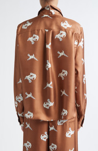 The Milan-founded label's dedication to impeccable craftsmanship shines through the sleek silk and softly tailored silhouette of this lustrous silk-twill button-up covered with an illustrative pattern of ravens. Front button closure Spread collar Long sleeves with button cuffs Chest patch pocket 100% silk Dry clean Made in Italy Designer Clothing