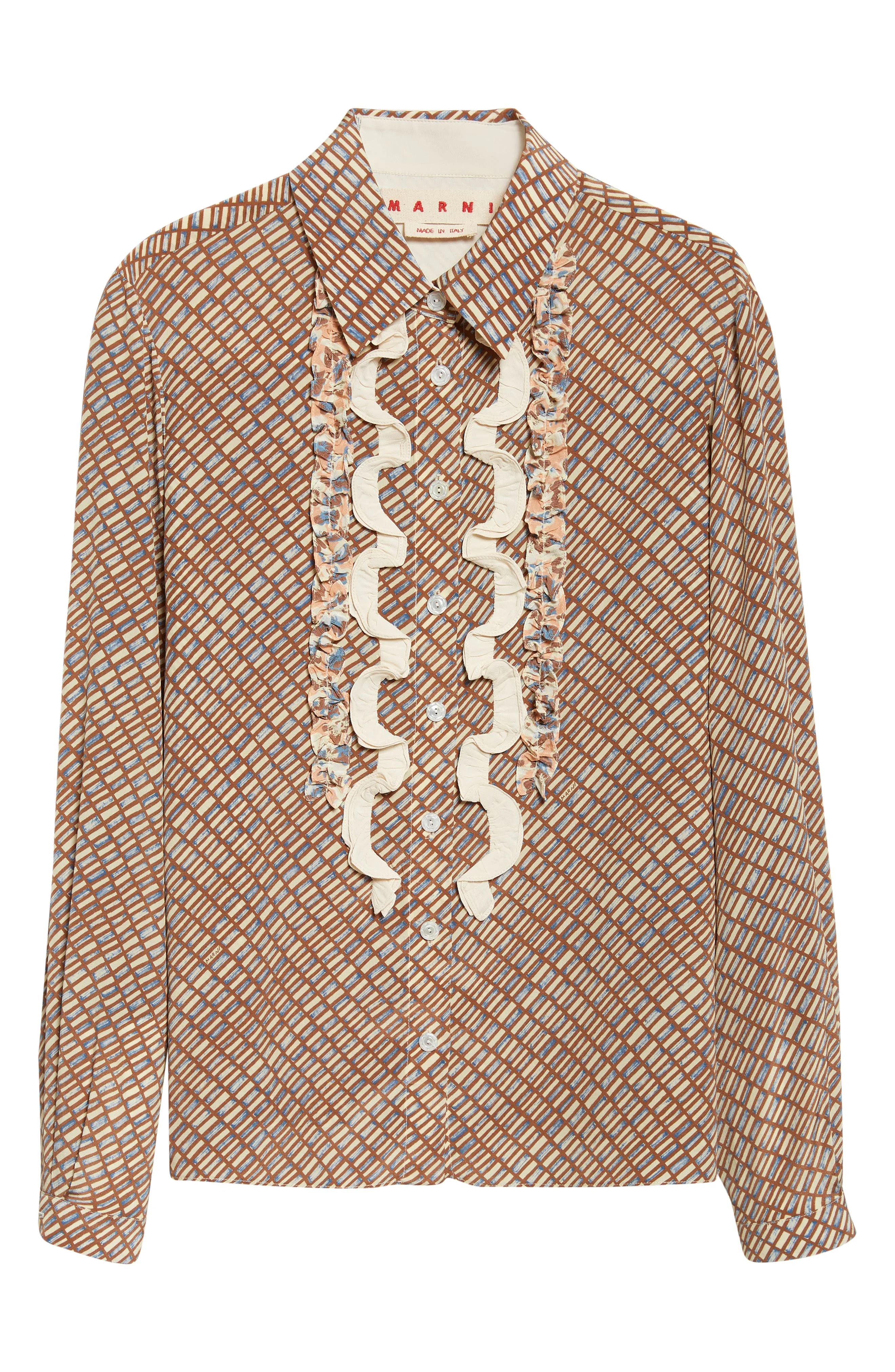 Marni Ruffle Appliqué Silk Crêpe de Chine Button-Up Shirt in Brown/Antique White at Nordstrom