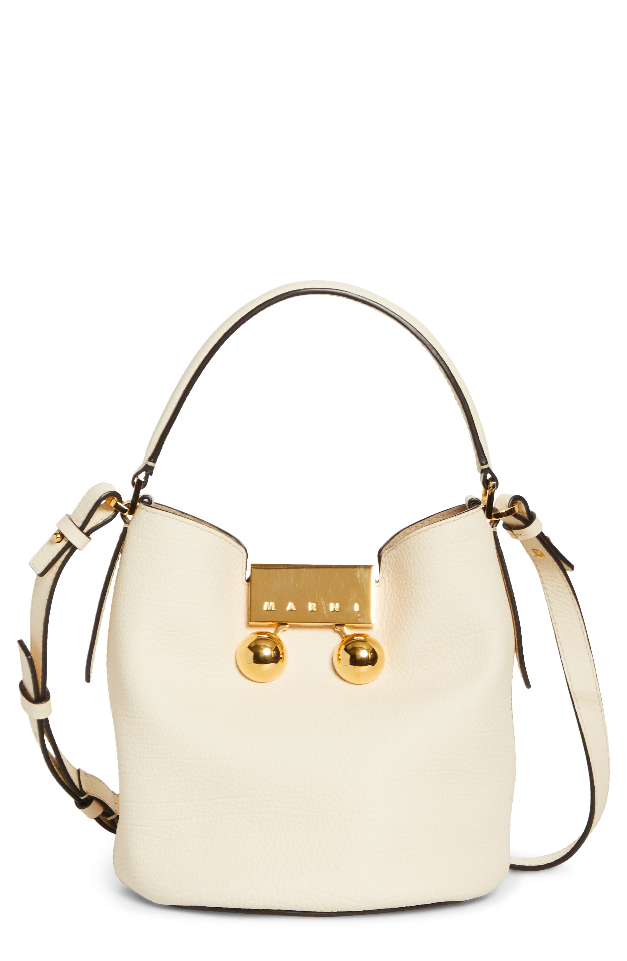 Gleaming hardware inspired by vintage travel trunks distinguishes this compact bucket bag crafted of pebbled calfskin leather. Kiss-lock closure Top carry handle; removable, adjustable crossbody strap Interior wall pocket Flat base for stability Suede lining Leather Made in Italy Designer Handbags