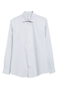 The Italian brand's aesthetic of relaxed sophistication is perfectly expressed in this latest iteration of the Genova shirt, patterned in faint, dense stripes. 31 1/2" length; 43" chest (size Medium) Front button closure Cutaway collar Long sleeves with button cuffs Curved hem 100% cotton Dry clean or machine wash, line dry Made in Italy Designer Clothing
