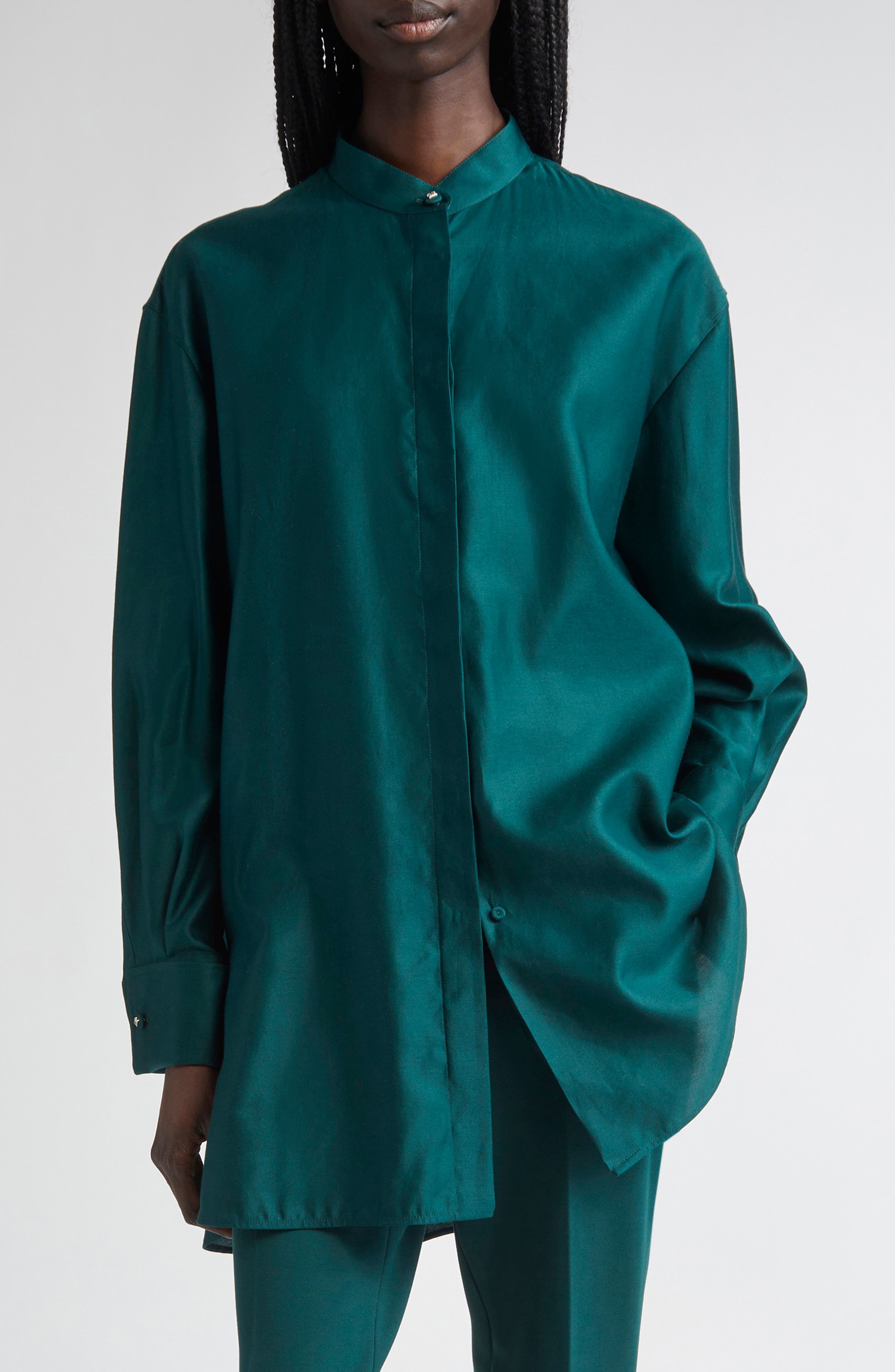 A jewel-like green hue enriches this button-up shirt made in a prominently oversized silhouette from lustrous cotton sateen Hidden-button placket Band collar Long sleeves with French cuffs 100% cotton Dry clean or machine wash, line dry Made in Italy Designer Clothing