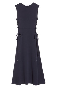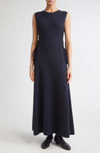 Corset-inspired side lacing adds a waist-accentuating flourish to this otherwise miminalist midi dress sewn from a fluid virgin-wool knit. Slips on over head Jewel neck Sleeveless 100% virgin wool Dry clean Imported Designer Clothing