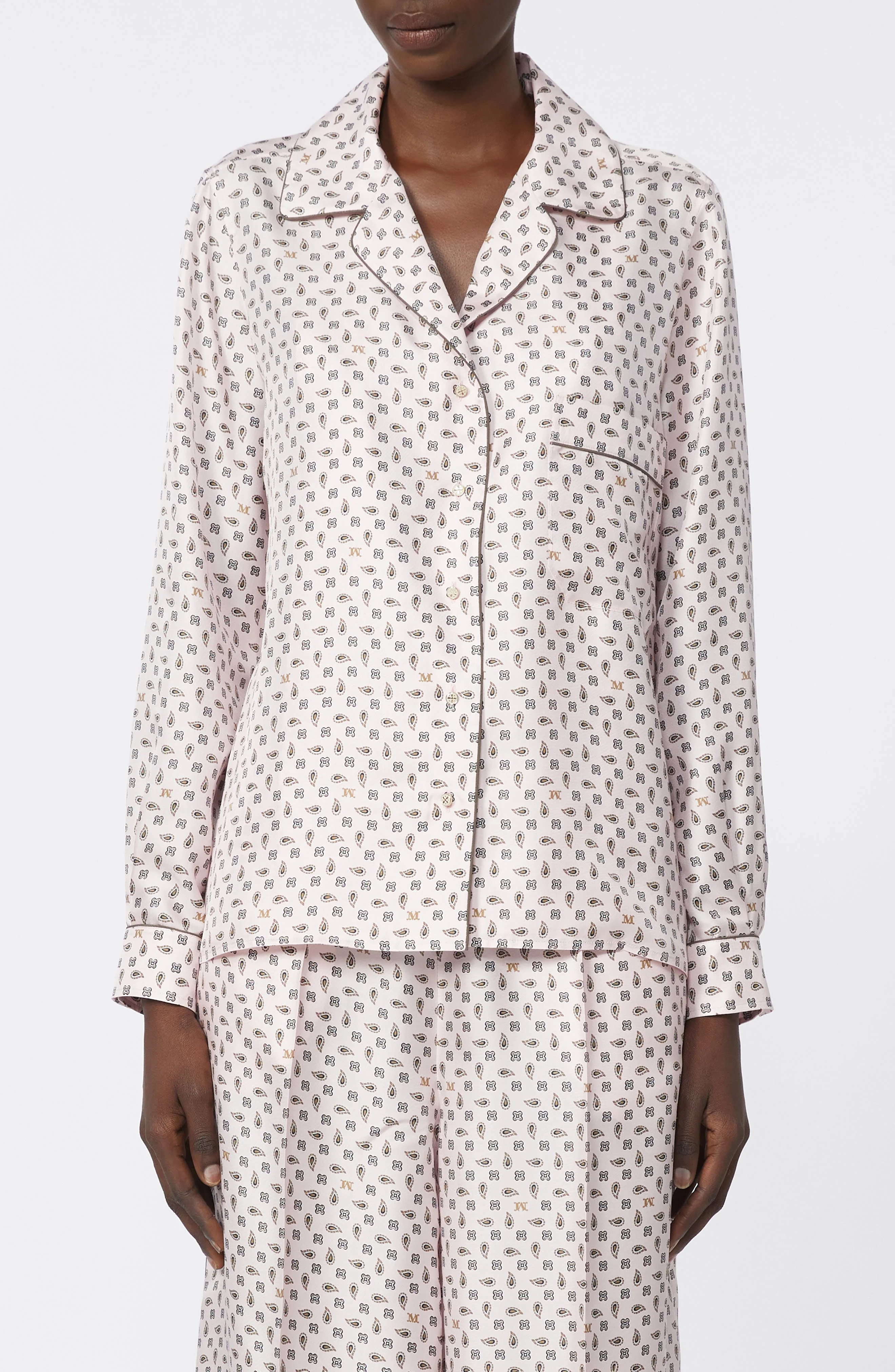 Max Mara's quintessential elegance takes an easygoing turn in this classically piped Italian-silk pajama shirt, where nostalgic paisley motifs mingle with a Tuscan-style monogram designed by artist Erberto Carboni for a 1958 ad campaign. Front button closure Notched collar Long sleeves with button cuffs Chest patch pocket 100% silk Dry clean Made in Italy Designer Clothing