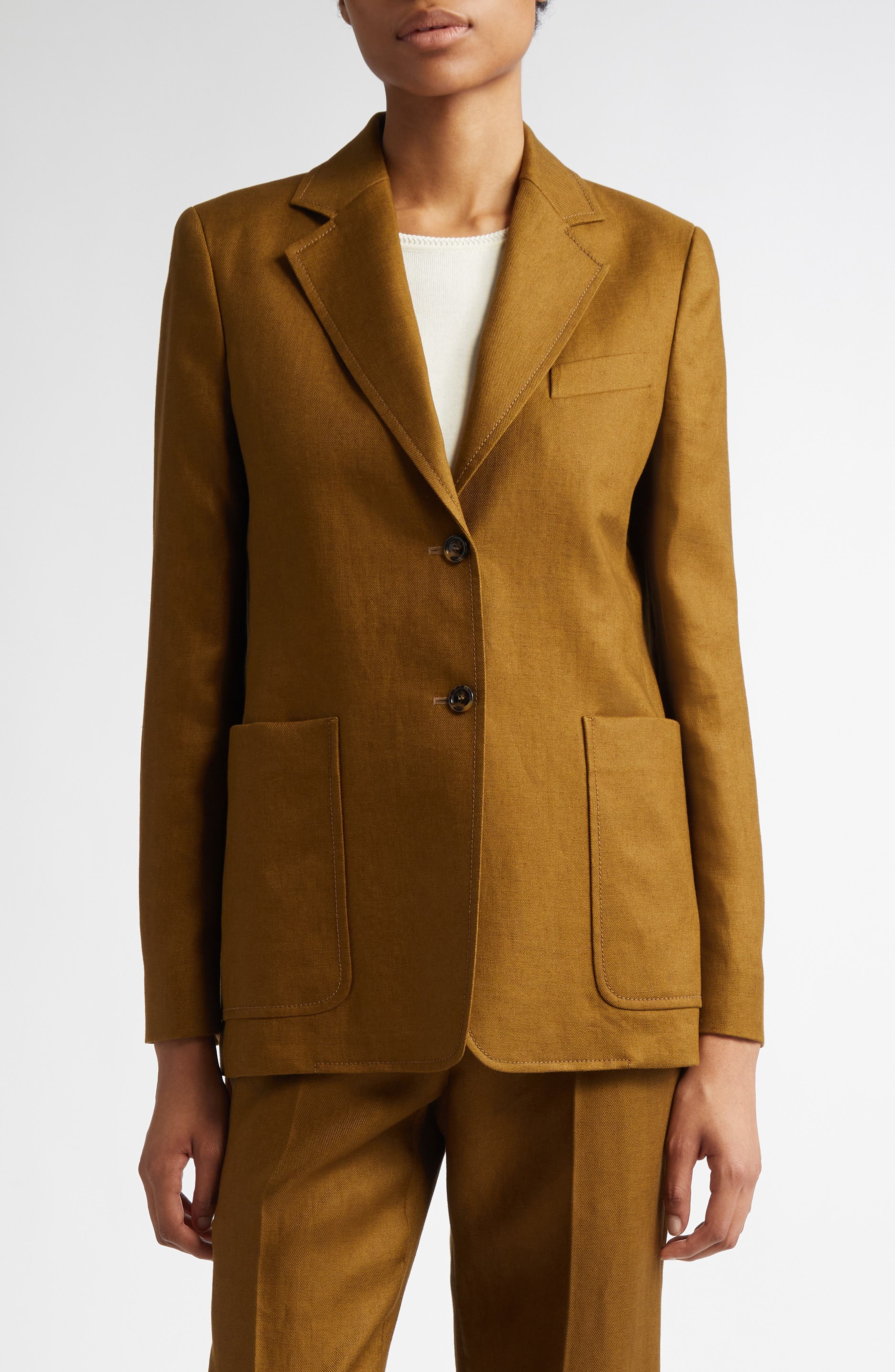 Durable yet refined, this single-breasted blazer in structured linen twill highlights the Italian fashion house’s dedication to impeccable tailoring. Notched lapels Four-button cuffs Chest welt pocket; front patch pockets Back vent Partially lined 100% linen Dry clean Made in Italy Designer Clothing