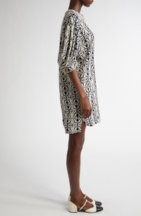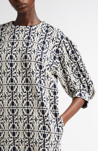 Monogram Ms create an intricate grid on this cotton-pique dress that's framed with elbow-length puff sleeves and discreet side-seam pockets. Dainty side slits nick the slanted high-low hem. Hidden back-zip closure Jewel neck Elbow-length sleeves Side-seam pockets Side slits Lined 100% cotton Hand wash, dry flat Made in Romania Designer Clothing