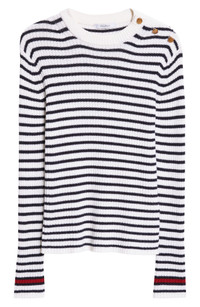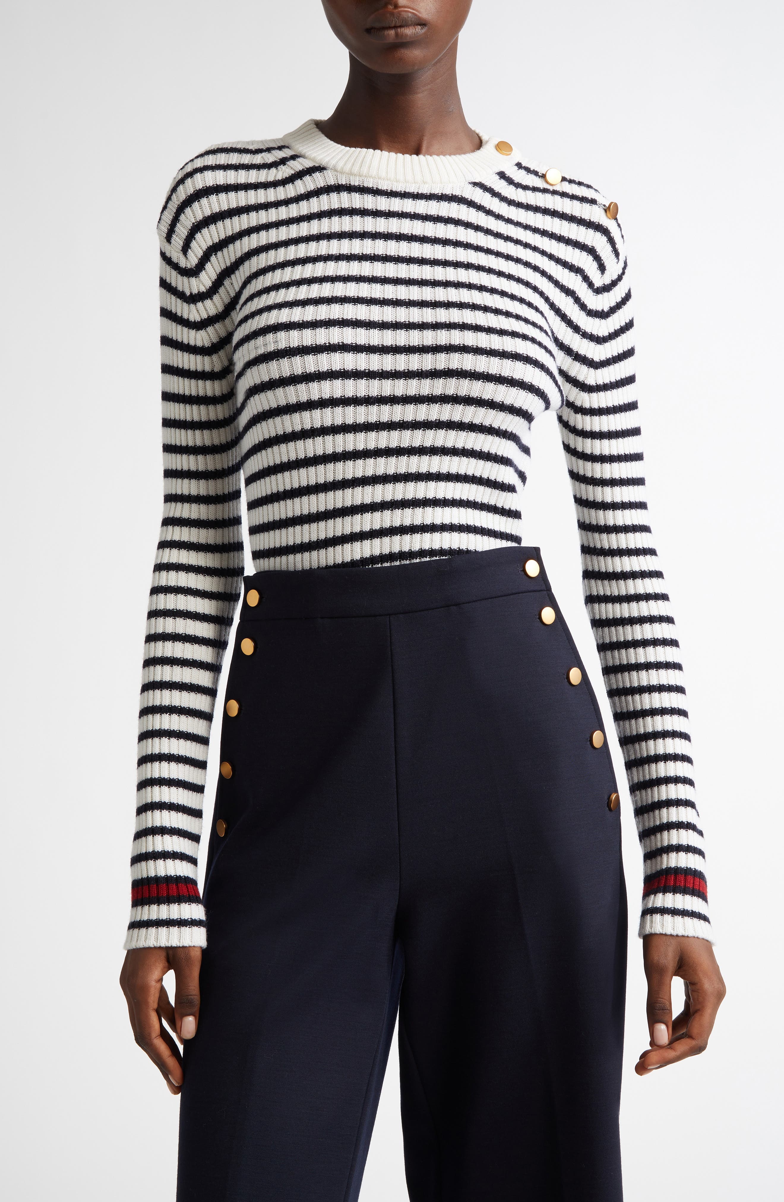 A trio of goldtone buttons gleam at the shoulder of this striped sweater knit from soft virgin wool in a figure-flattering fit that's perfect for layering. Shoulder button closure Crewneck Long sleeves 100% virgin wool Dry clean or hand wash, dry flat Imported Designer Clothing