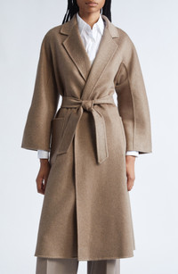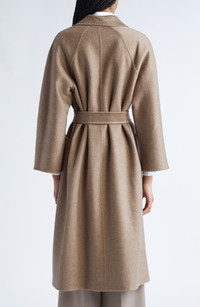 Luxurious double-face cashmere creates enviable warmth and elegant drape for this hand-sewn coat designed in a slightly flared silhouette kimono-inspired sleeves and patch pockets. Open front Notched lapels Front patch pockets Removable belt 100% cashmere Dry clean Made in Italy Designer Clothing