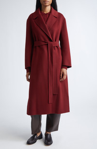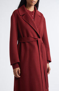 Stand out with the rich berry hue of this longline coat handsewn from double-face virgin wool and cinched with a tie belt. Open front Notched lapels Side-seam pockets Removable belt 100% virgin wool Dry clean Imported Designer Clothing