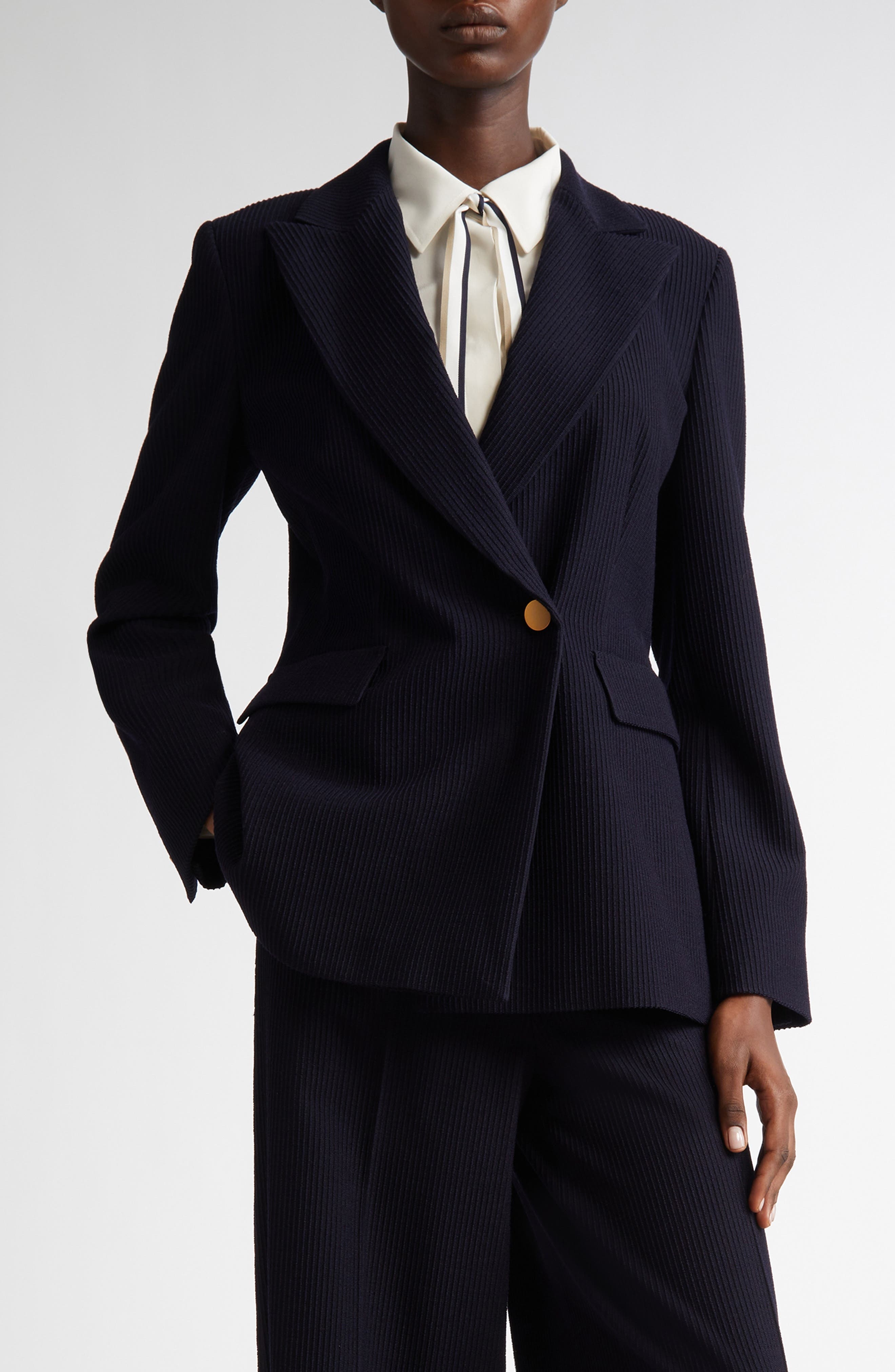 Soft garbardine wool textures this tailored Italian-crafted suiting jacket shaped by an asymmetric closure and accented with brushed golden hardware. One-button closure Peaked lapels Four-button cuffs Decorative pocket flaps Lined 90% virgin wool, 8% polyamide, 2% elastane Dry clean Made in Italy Designer Clothing