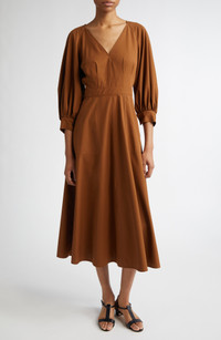 Brown dresses are having their moment in the spotlight and this fit-and-flare poplin version framed with voluminous sleeves offers an effortlessly stylish way to embrace the trend. Hidden back-zip closure V-neck Three-quarter sleeves with button cuffs Front slant pockets 100% cotton Dry clean Made in Italy Designer Clothing