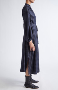 Gathers at back bring swingy movement to the skirt of this caftan-inspired dress fashioned from silk twill with boardroom-approved pinstripes. Back keyhole with button-and-loop closure Stand collar Long sleeves with French cuffs Side slits 100% silk Dry clean Made in Italy Designer Clothing