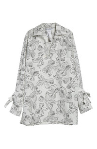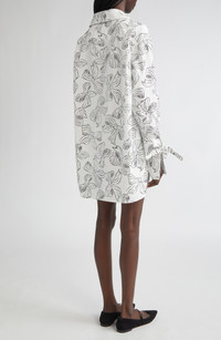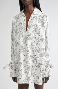 An illustrated bow print—the graceful refrain of the pre-fall '25 collection—echoes the tied cuffs of this crisp cotton-poplin minidress. Slips on over head Johnny collar Long sleeves with tie cuffs Chest patch pockets Side slits Unlined 100% cotton Dry clean or machine wash, line dry Made in Italy Designer Clothing