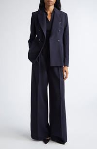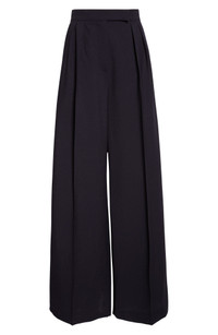Double front pleats enhance the dramatic flare of the wide-cut legs on these high-waist pants tailored from richly textured wool-blend seersucker. Zip fly with hook-and-bar closure Front slant pockets 96% virgin wool, 3% polyamide, 1% elastane Dry clean Made in Italy Designer Clothing