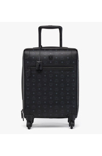 Small Visetos cabin trolley with nappa leather trim Retractable trolley handle Side leather grab handle MCM logo plate Front zip compartment Leather-wrapped corners Two-way zip-around closure Interior zip compartments