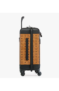 Small Visetos cabin trolley with nappa leather trim Retractable trolley handle Side leather grab handle MCM logo plate Front zip compartment Leather-wrapped corners Two-way zip-around closure Interior zip compartments