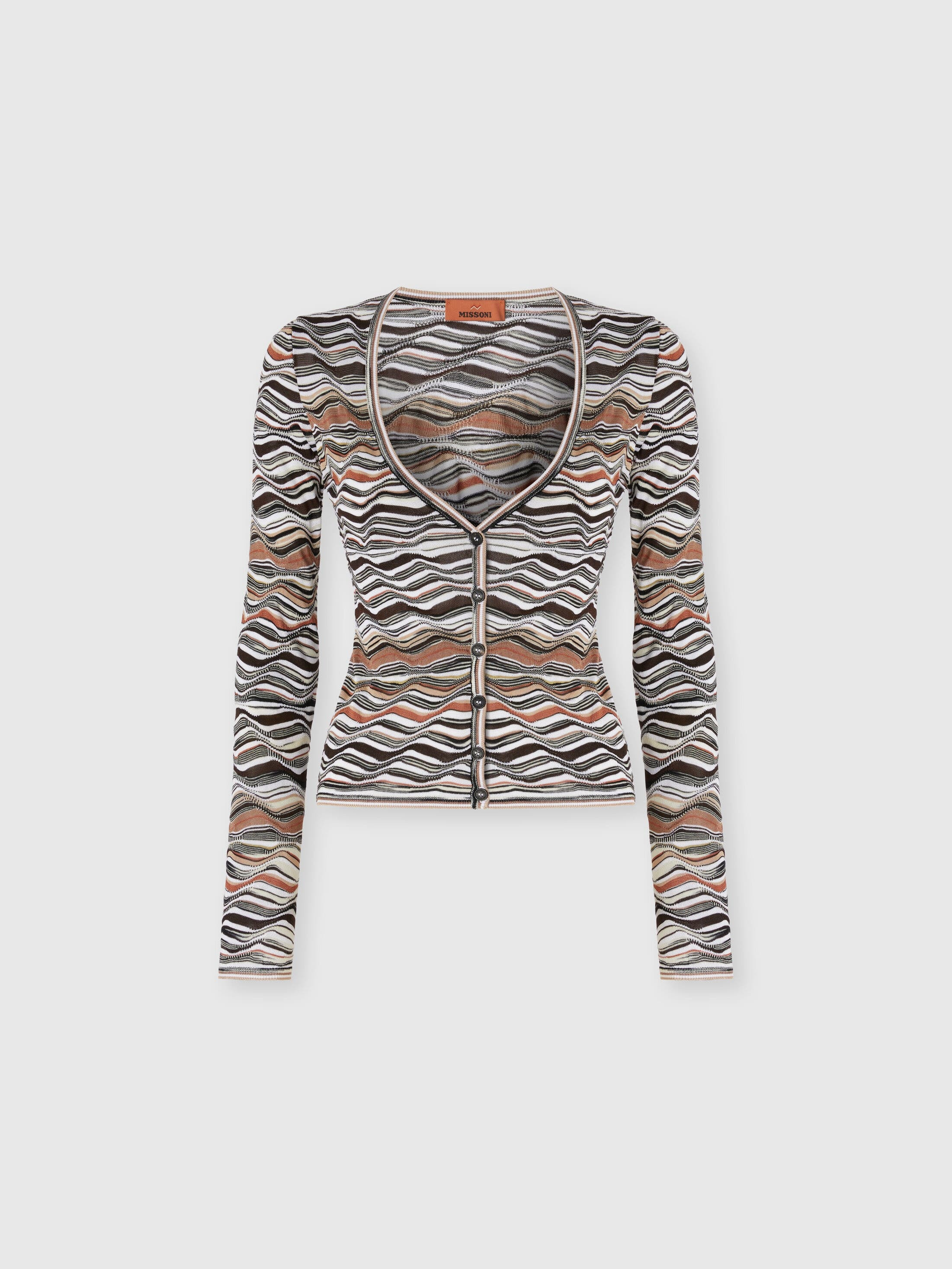 Missoni gets back to the essence, where matter and colour merge. Clothes are the words, but the speeches and stories are of those who wear them. The accent is on outerwear and tailoring: enveloping coats, trench coats, fluid suits, buttonless blazers, loose trousers. Extremes that meet, long tight dresses and liquid ones like caftans, graphic miniskirts and vaporous shirts. A transversal vision, where the sensuality of the body is felt, revealed or barely perceived. Buttoned cardigan V-neck Wave pattern Wool and viscose blend Ironing maximum temperature 110°C - without steam Dry cleaning in tetrachloroethene Dry flat Iron inside out Steam iron only Do not tumble dry Do not wash Do not bleach