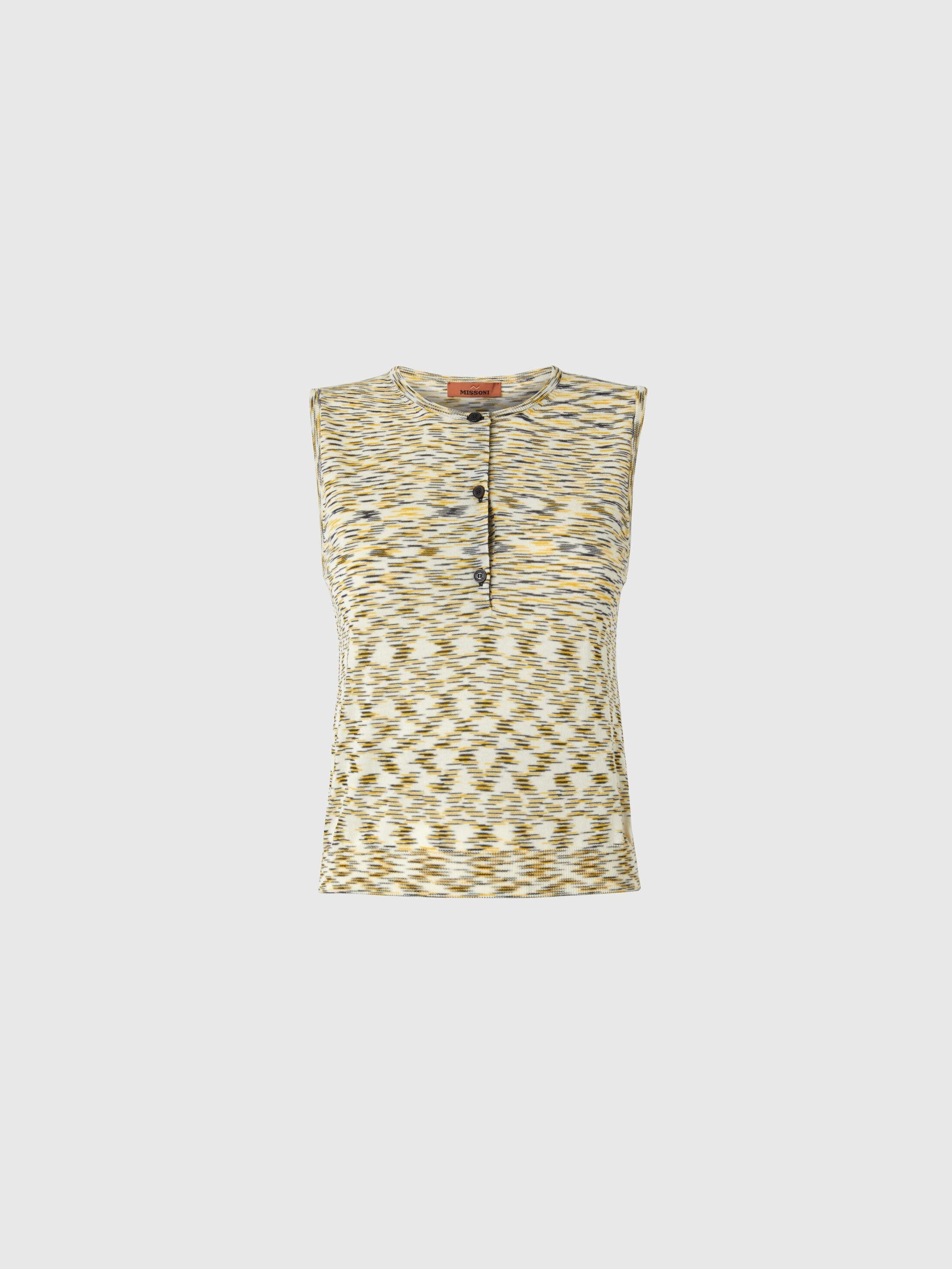 Missoni gets back to the essence, where matter and colour merge. Clothes are the words, but the speeches and stories are of those who wear them. The accent is on outerwear and tailoring: enveloping coats, trench coats, fluid suits, buttonless blazers, loose trousers. Extremes that meet, long tight dresses and liquid ones like caftans, graphic miniskirts and vaporous shirts. A transversal vision, where the sensuality of the body is felt, revealed or barely perceived. Buttoned vest Flame plain knit Wool blend Hand wash Ironing maximum temperature 110°C - without steam Dry cleaning in tetrachloroethene - mild process Wash inside out Dry flat Do not tumble dry COOL HAND WASH Iron with a cloth between Do not bleach