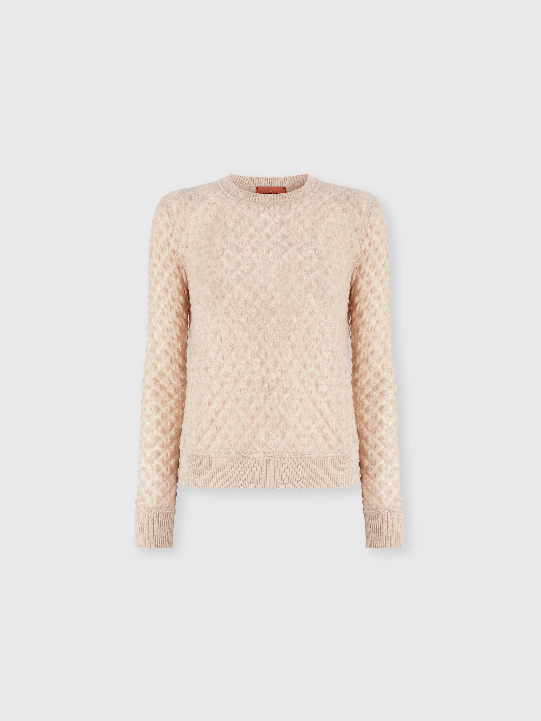 Missoni presents the Spring-Summer 2026 collection: a celebration of femininity, lightness, and colour. A collection that tells the story of beauty through contrasts: flowing lines, exquisite craftsmanship, and the brand’s unmistakable identity. Iconic zigzags, lurex weaves and textures capture the light, combining elegance and freedom. Women's crewneck pullover Long sleeves Raschel knit Lace pattern 100% cashmere Dry cleaning in tetrachloroethene - mild process Ironing maximum temperature 110°C - without steam Dry flat Do not tumble dry Do not wash Do not bleach