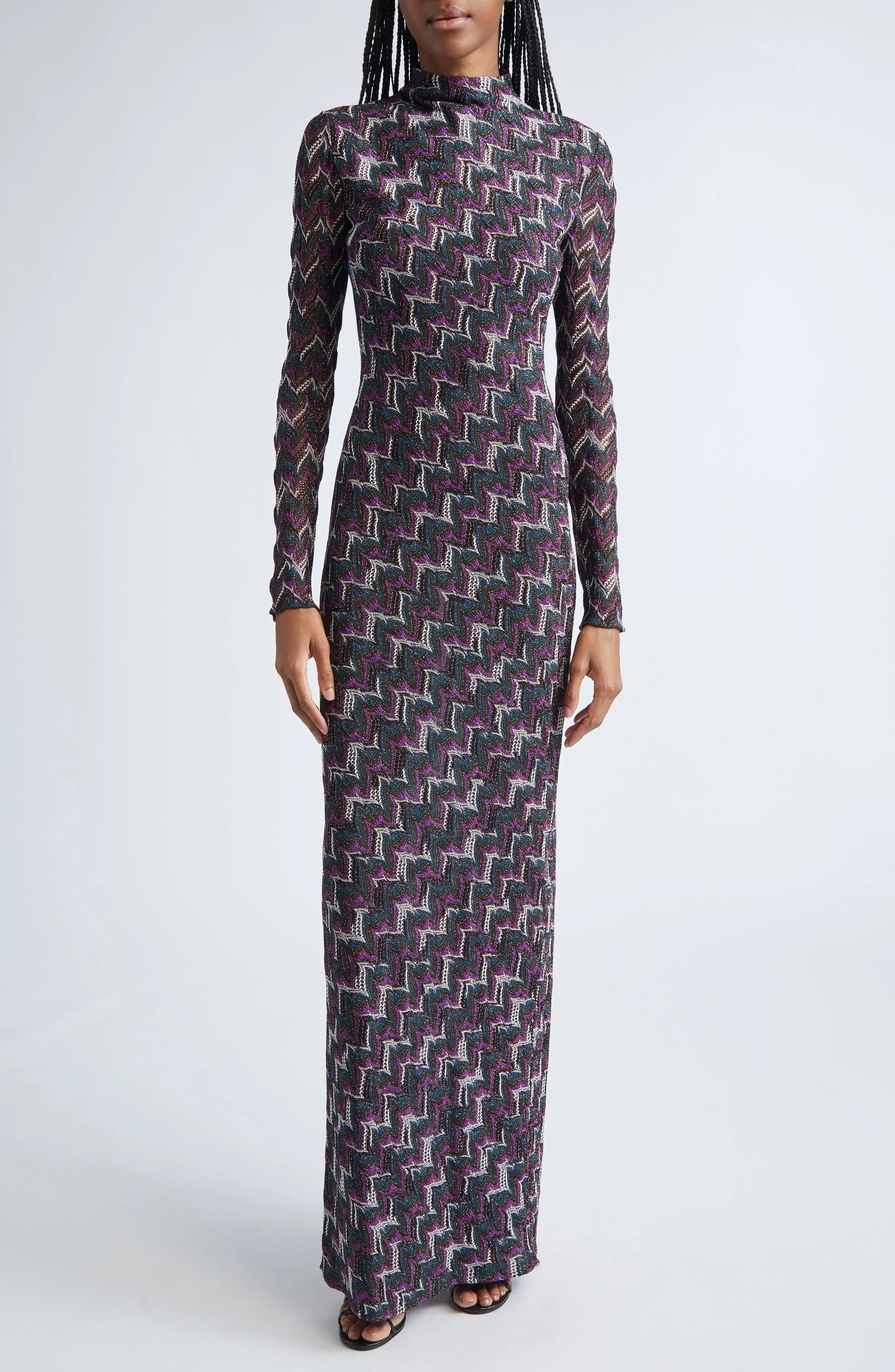 The Italian design house's signature zigzag stripes animate this figure-skimming dress sewn from a raschel-lace knit with metallic fibers that highlight the texture. Hidden back-zip closure Funnel neck Long sleeves Back slit Lined 89% viscose, 11% metallic fibers Dry clean or hand wash, dry flat Made in Italy Designer Clothing