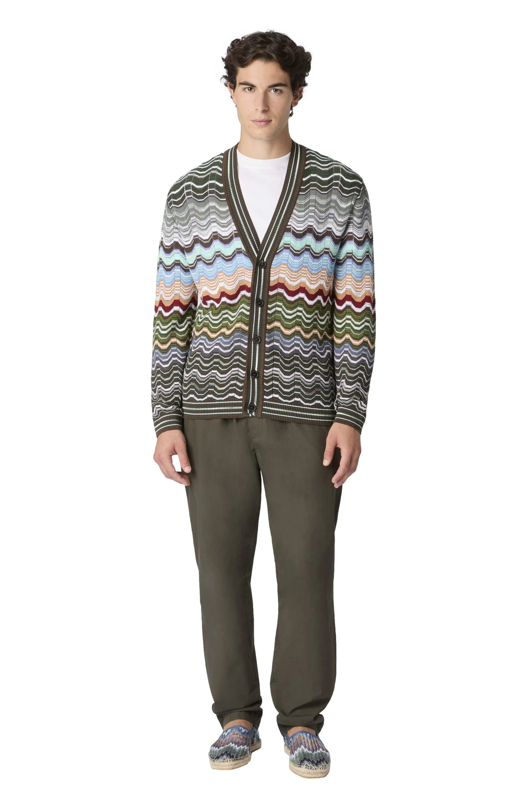 Missoni presents the Spring-Summer 2026 collection: a celebration of femininity, lightness, and colour. A collection that tells the story of beauty through contrasts: flowing lines, exquisite craftsmanship, and the brand’s unmistakable identity. Iconic zigzags, lurex weaves and textures capture the light, combining elegance and freedom. Men’s cardigan with striped trims Greek chevron pattern Cotton and viscose blend Dry cleaning in tetrachloroethene - mild process Ironing maximum temperature 110°C - without steam Hand wash Do not tumble dry Dry flat Iron with a cloth between Do not bleach