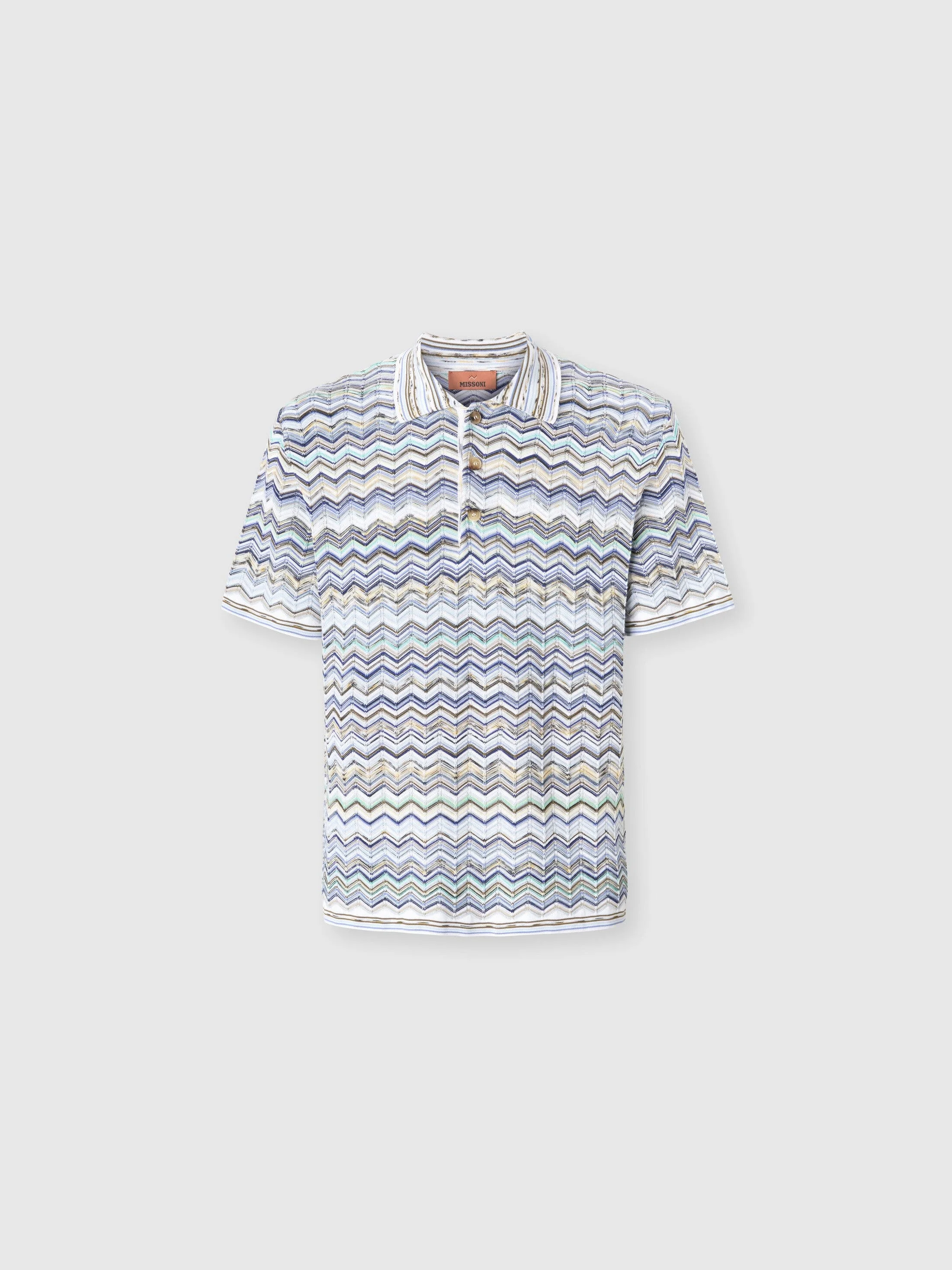 Missoni presents the Spring-Summer 2026 collection: a celebration of femininity, lightness, and colour. A collection that tells the story of beauty through contrasts: flowing lines, exquisite craftsmanship, and the brand’s unmistakable identity. Iconic zigzags, lurex weaves and textures capture the light, combining elegance and freedom. Men’s short-sleeved polo shirt Chevron pattern Striped collar 100% cotton Dry cleaning in tetrachloroethene - mild process Hand wash Ironing maximum temperature 110°C - without steam Do not tumble dry Dry flat Iron with a cloth between Do not bleach