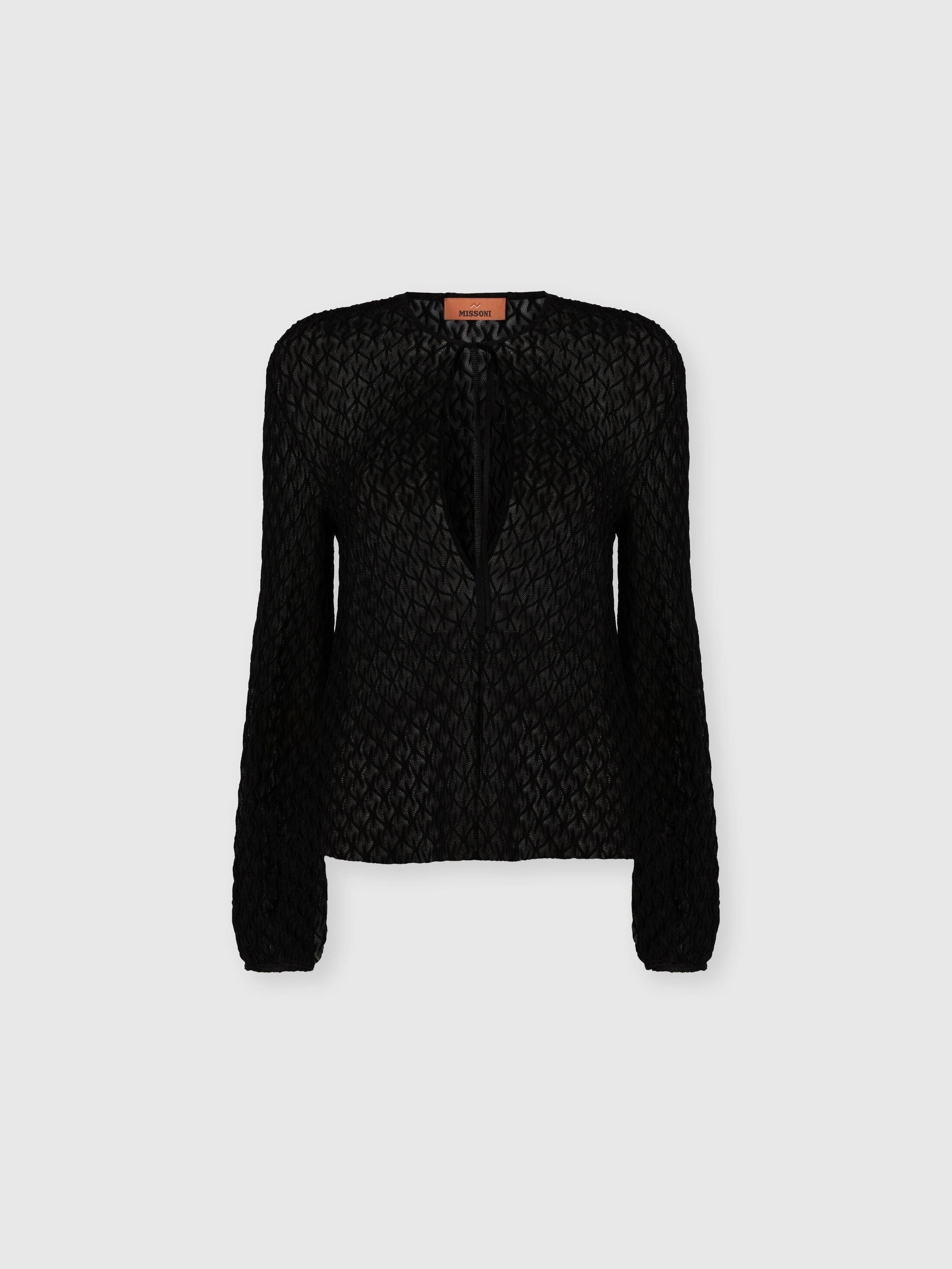 Missoni gets back to the essence, where matter and colour merge. Clothes are the words, but the speeches and stories are of those who wear them. The accent is on outerwear and tailoring: enveloping coats, trench coats, fluid suits, buttonless blazers, loose trousers. Extremes that meet, long tight dresses and liquid ones like caftans, graphic miniskirts and vaporous shirts. A transversal vision, where the sensuality of the body is felt, revealed or barely perceived. Crew neck blouse Raschel knit in raised lace pattern Solid color Wool blend Ironing maximum temperature 110°C - without steam Dry cleaning in tetrachloroethene - mild process Do not tumble dry Dry flat Do not wash Do not bleach