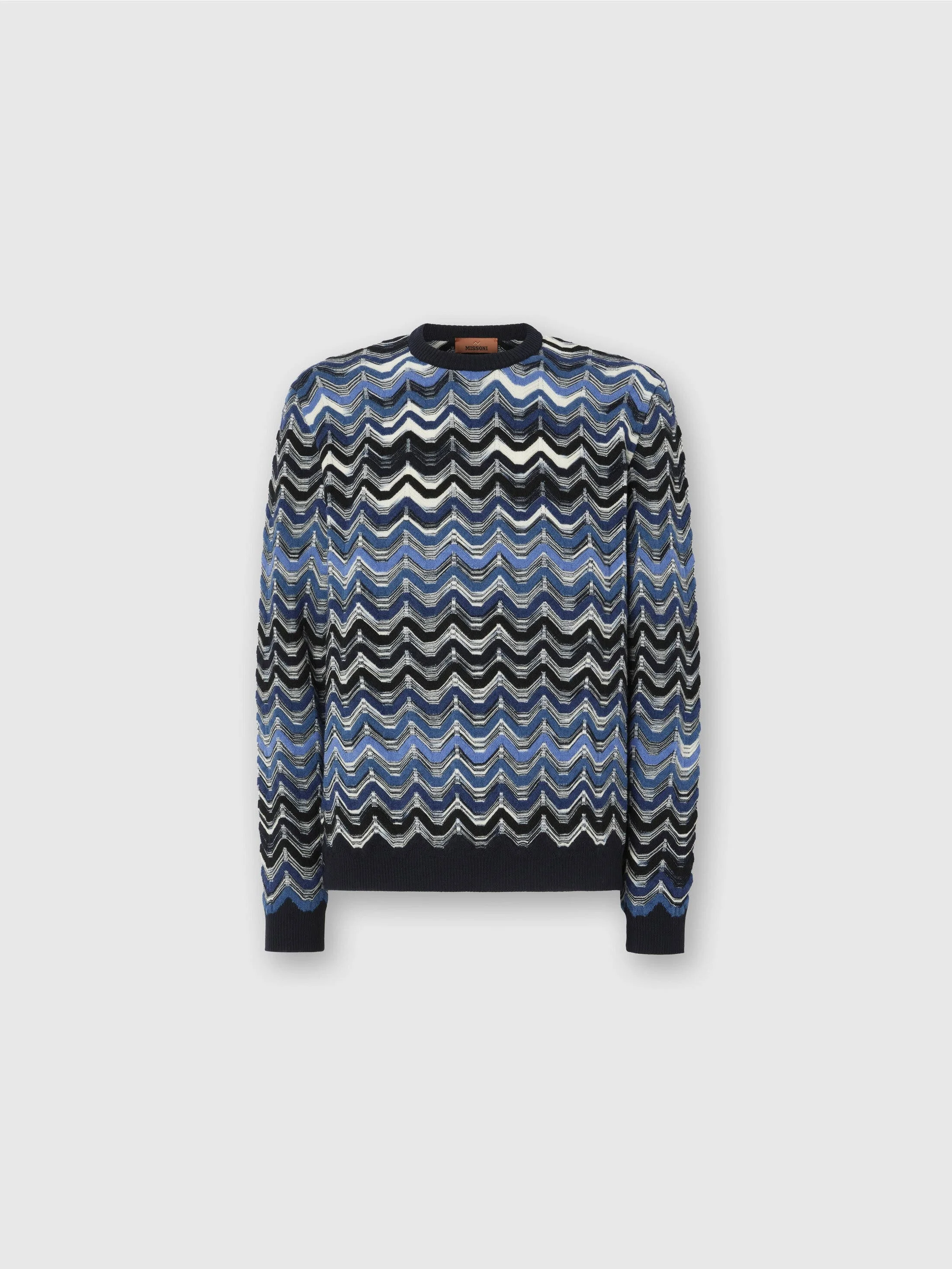 Missoni gets back to the essence, where matter and colour merge. Clothes are the words, but the speeches and stories are of those who wear them. The accent is on outerwear and tailoring: enveloping coats, trench coats, fluid suits, buttonless blazers, loose trousers. Extremes that meet, long tight dresses and liquid ones like caftans, graphic miniskirts and vaporous shirts. A transversal vision, where the sensuality of the body is felt, revealed or barely perceived. Crew-neck sweater Geometric zigzag pattern 100% wool Ironing maximum temperature 110°C - without steam Hand wash Dry cleaning in tetrachloroethene Do not tumble dry Dry flat Do not bleach