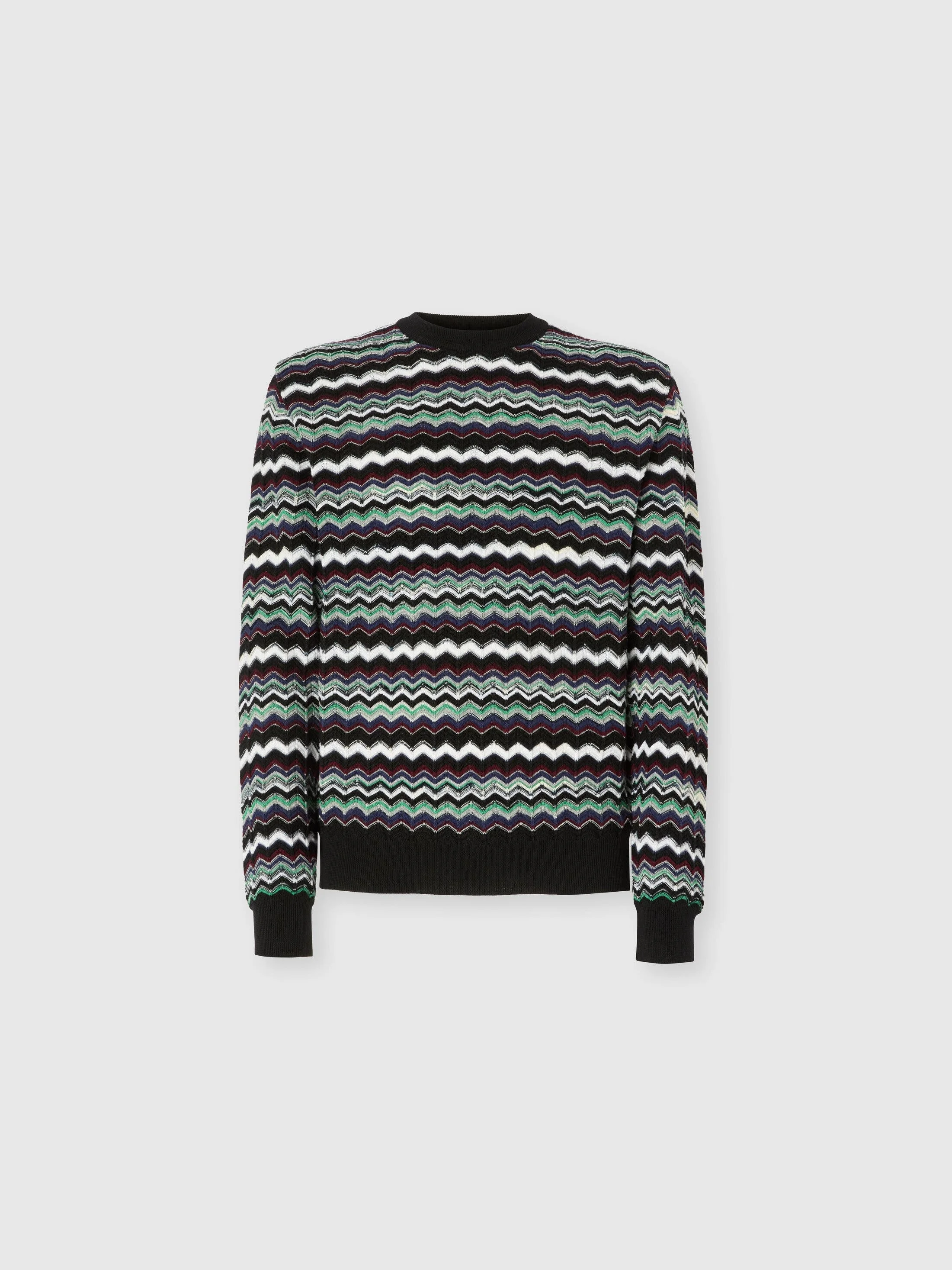 Missoni gets back to the essence, where matter and colour merge. Clothes are the words, but the speeches and stories are of those who wear them. The accent is on outerwear and tailoring: enveloping coats, trench coats, fluid suits, buttonless blazers, loose trousers. Extremes that meet, long tight dresses and liquid ones like caftans, graphic miniskirts and vaporous shirts. A transversal vision, where the sensuality of the body is felt, revealed or barely perceived. Crew-neck sweater Zigzag pattern Wool and cotton blend Hand wash Ironing maximum temperature 110°C - without steam Dry cleaning in tetrachloroethene Dry flat Do not tumble dry Do not bleach