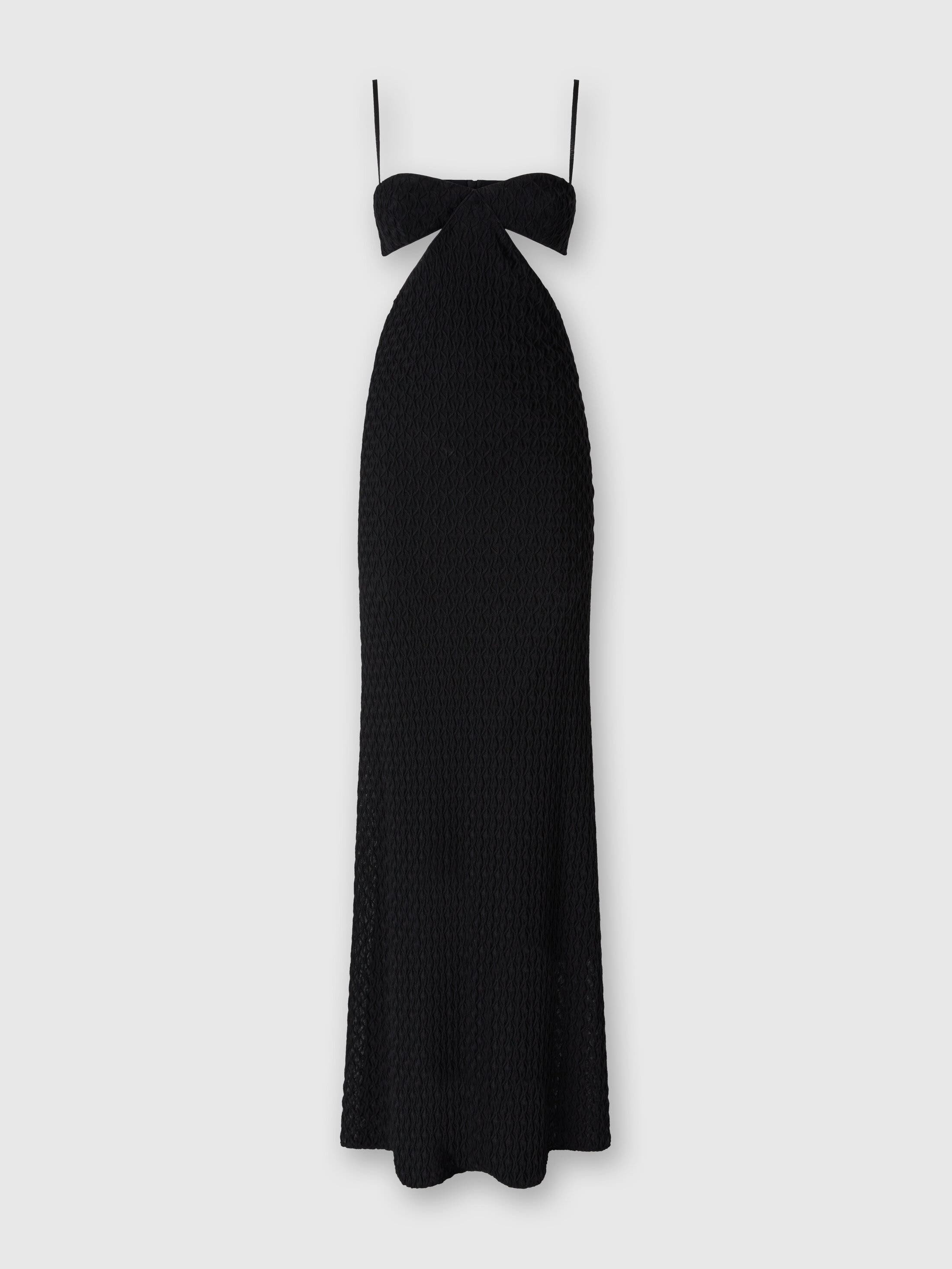 Missoni gets back to the essence, where matter and colour merge. Clothes are the words, but the speeches and stories are of those who wear them. The accent is on outerwear and tailoring: enveloping coats, trench coats, fluid suits, buttonless blazers, loose trousers. Extremes that meet, long tight dresses and liquid ones like caftans, graphic miniskirts and vaporous shirts. A transversal vision, where the sensuality of the body is felt, revealed or barely perceived. Cut-out long dress Raschel knit Relief lace motif Wool blend Ironing maximum temperature 110°C - without steam Dry cleaning in tetrachloroethene - mild process Dry flat Do not tumble dry Do not wash Do not bleach