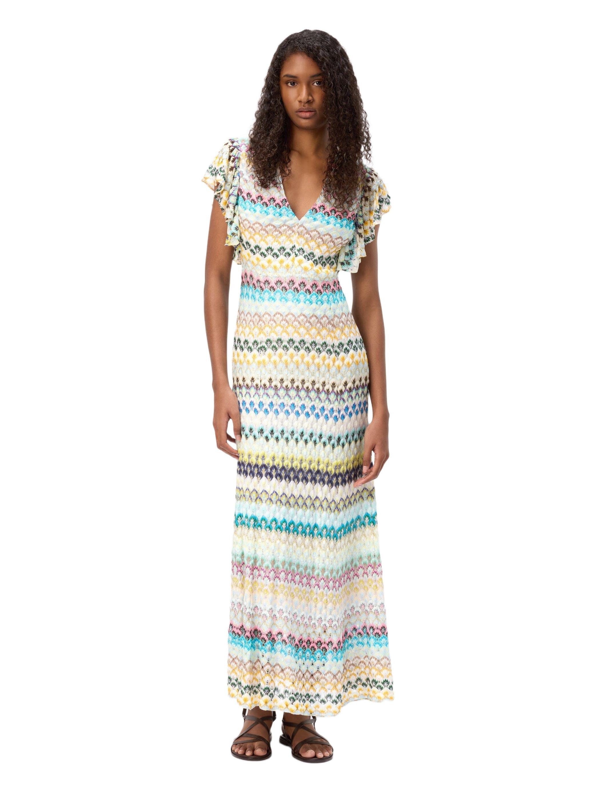 Missoni SS25 collection takes inspiration from the deserts, the sand, the oasis, and the color of the sky. The warmer color tones, reflect the endless lands of sand and all their hues. Green grass of the oasis, blue waters and contrast with the sandy color of the desert cover the rest of the collection's palette. The influence of this atmosphere echoes in the looks through stratifications, materials which are drier to the touch, fluidity and softness of shapes. Women's long dress Lace workmanship V-neck Ruffled sleeves Degrade effect Dry cleaning in tetrachloroethene - mild process Dry flat Steam iron only Do not tumble dry Do not wash Do not iron Do not bleach