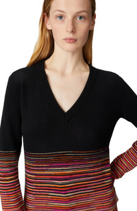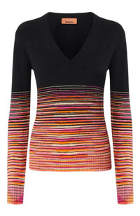 Contemporary sleekness and liberated sensuality imbue the Missoni Fall 2024 collection. Offsetting the masculine and the feminine, swinging between the slouchy and the skintight, the collection features pieces that build an ongoing Missoni wardrobe: long and short dresses, skimpy maxi-cardigans and blouson cardigans meant as outerwear; playful faux fur coats and pencil coats with faux fur oversized collars and trims; fluid pantsuits; jumpsuits and tops. Crop cut T-shirt Crew neck model Degrade slub cashmere 3/4 sleeves Ironing maximum temperature 110°C - without steam Hand wash Dry cleaning in tetrachloroethene COOL HAND WASH Iron inside out Do not tumble dry Dry flat Use neutral detergent Do not bleach