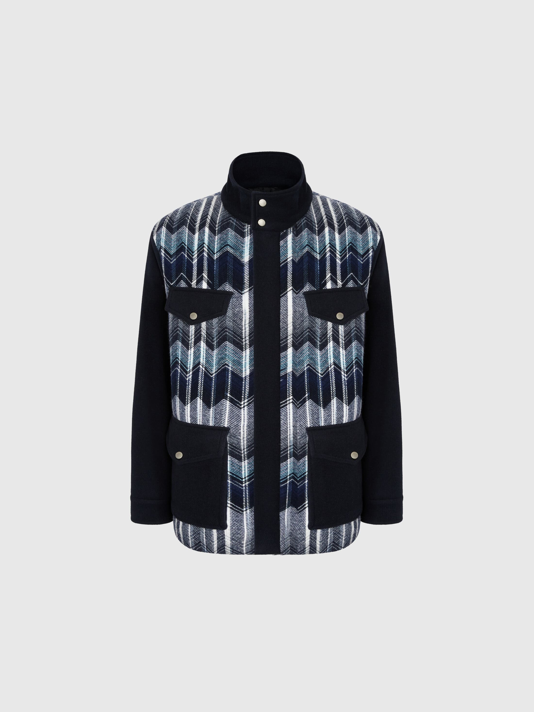 Missoni gets back to the essence, where matter and colour merge. Clothes are the words, but the speeches and stories are of those who wear them. The accent is on outerwear and tailoring: enveloping coats, trench coats, fluid suits, buttonless blazers, loose trousers. Extremes that meet, long tight dresses and liquid ones like caftans, graphic miniskirts and vaporous shirts. A transversal vision, where the sensuality of the body is felt, revealed or barely perceived. Field jacket Loom-knit construction Woven zigzag pattern Wool and cotton blend Ironing maximum temperature 110°C - without steam Dry cleaning in tetrachloroethene - mild process Do not tumble dry COOL HAND WASH Do not wash Do not bleach