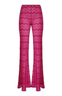 Contemporary sleekness and liberated sensuality imbue the Missoni Fall 2024 collection. Offsetting the masculine and the feminine, swinging between the slouchy and the skintight, the collection features pieces that build an ongoing Missoni wardrobe: long and short dresses, skimpy maxi-cardigans and blouson cardigans meant as outerwear; playful faux fur coats and pencil coats with faux fur oversized collars and trims; fluid pantsuits; jumpsuits and tops. Cover-up trousers Flare Pattern Viscose and lame Zig zag pattern Ironing maximum temperature 110°C - without steam Dry cleaning in tetrachloroethene Do not tumble dry Do not wash Do not bleach