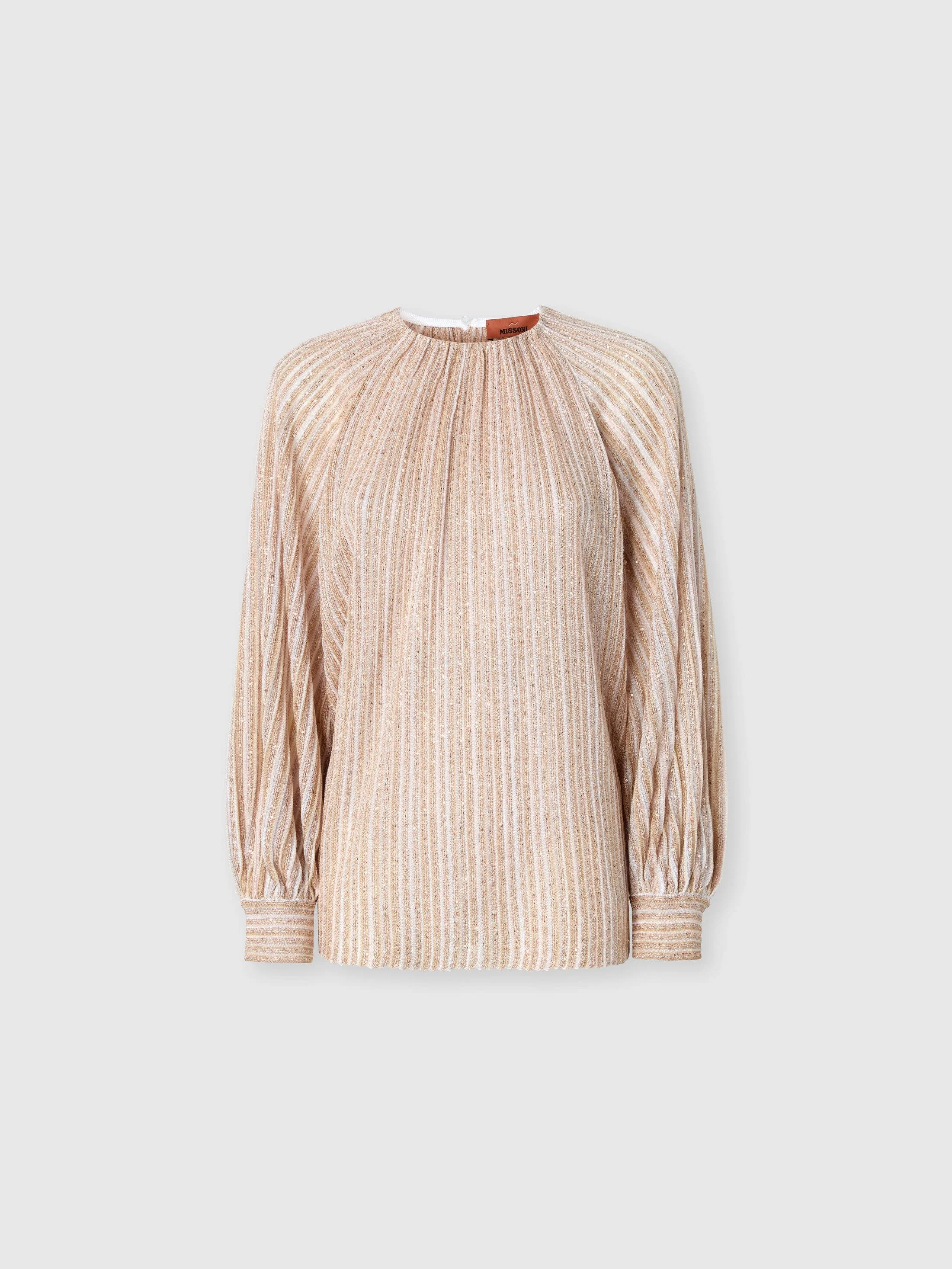 Missoni gets back to the essence, where matter and colour merge. Clothes are the words, but the speeches and stories are of those who wear them. The accent is on outerwear and tailoring: enveloping coats, trench coats, fluid suits, buttonless blazers, loose trousers. Extremes that meet, long tight dresses and liquid ones like caftans, graphic miniskirts and vaporous shirts. A transversal vision, where the sensuality of the body is felt, revealed or barely perceived. Women's long-sleeve flared crew-neck top Striped knit Viscose blend with lame yarns Dry cleaning in tetrachloroethene - mild process Ironing maximum temperature 110°C - without steam Wash in net bag Iron inside out Dry inside out Dry flat Do not tumble dry Do not wash Do not bleach