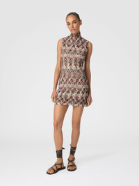 Missoni gets back to the essence, where matter and colour merge. Clothes are the words, but the speeches and stories are of those who wear them. The accent is on outerwear and tailoring: enveloping coats, trench coats, fluid suits, buttonless blazers, loose trousers. Extremes that meet, long tight dresses and liquid ones like caftans, graphic miniskirts and vaporous shirts. A transversal vision, where the sensuality of the body is felt, revealed or barely perceived. Sleeveless mini dress High neck Raschel knit with lace-effect Lurex threads Viscose blend Dry cleaning in tetrachloroethene - mild process Ironing maximum temperature 110°C - without steam Do not tumble dry Dry flat Do not wash Do not bleach