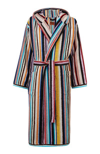 Contemporary sleekness and liberated sensuality imbue the Missoni Fall 2024 collection. Offsetting the masculine and the feminine, swinging between the slouchy and the skintight, the collection features pieces that build an ongoing Missoni wardrobe: long and short dresses, skimpy maxi-cardigans and blouson cardigans meant as outerwear; playful faux fur coats and pencil coats with faux fur oversized collars and trims; fluid pantsuits; jumpsuits and tops. Cotton terry bathrobe with lurex Pattern with stripes Waist belt Hood Patch pockets Ironing maximum temperature 150°C Do not dry clean Tumble drying at lower temperature Wash max 40°C Do not bleach