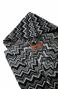 Contemporary sleekness and liberated sensuality imbue the Missoni Fall 2024 collection. Offsetting the masculine and the feminine, swinging between the slouchy and the skintight, the collection features pieces that build an ongoing Missoni wardrobe: long and short dresses, skimpy maxi-cardigans and blouson cardigans meant as outerwear; playful faux fur coats and pencil coats with faux fur oversized collars and trims; fluid pantsuits; jumpsuits and tops. Cotton terry bathrobe Chevron pattern Waist belt Hood Patch pockets Ironing maximum temperature 150°C Do not dry clean Tumble drying at lower temperature Wash max 40°C Do not bleach