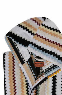Contemporary sleekness and liberated sensuality imbue the Missoni Fall 2024 collection. Offsetting the masculine and the feminine, swinging between the slouchy and the skintight, the collection features pieces that build an ongoing Missoni wardrobe: long and short dresses, skimpy maxi-cardigans and blouson cardigans meant as outerwear; playful faux fur coats and pencil coats with faux fur oversized collars and trims; fluid pantsuits; jumpsuits and tops. Long cotton terry hooded bathrobe Multicoloured chevron pattern Waist belt Patch pockets Ironing maximum temperature 150°C Do not dry clean Tumble drying at lower temperature Wash max 40°C Do not bleach