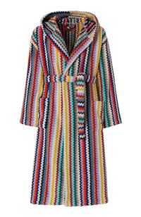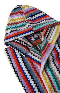 Contemporary sleekness and liberated sensuality imbue the Missoni Fall 2024 collection. Offsetting the masculine and the feminine, swinging between the slouchy and the skintight, the collection features pieces that build an ongoing Missoni wardrobe: long and short dresses, skimpy maxi-cardigans and blouson cardigans meant as outerwear; playful faux fur coats and pencil coats with faux fur oversized collars and trims; fluid pantsuits; jumpsuits and tops. Cotton terry bathrobe Zigzag pattern Waist belt Hood Patch pockets Ironing maximum temperature 150°C Do not dry clean Tumble drying at lower temperature Wash max 40°C Do not bleach
